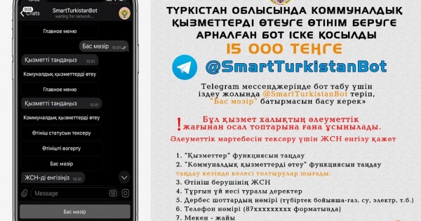 Айта кетейік, Telegram мессенджерінде бот табу үшін іздеу жолында @SmartTurkistanBot теріп, «Бас мәзір» батырмасын басу қажет. Бұл қызмет халықтың әлеуметтік жағынан осал топтарына ғана ұсынылады.