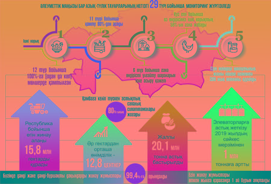 بۇۇ ازىق-ت ۇلىك جانە اۋىل شارۋاشىلىعى ۇيىمىنىڭ (FAO) بولجامدارى بويىنشا قازاقستان اقش, اۋستراليا, برازيليا جانە ارگەنتينا ەلدەرىمەن قاتار الەمدىك ازىق-ت ۇلىك حابتارىنىڭ بىرىنە اينالۋ ءۇشىن ۇلكەن الەۋەتكە يە. مەملەكەت تاراپىنان اوك-ءتى قولداۋدىڭ بارلىق قاجەتتى شارالارى كورسەتىلەدى, سۋبسيديالار بەرىلەدى (16 باعىت بويىنشا سۋبسيديالاردىڭ 47 ءتۇرى), جەڭىلدىكپەن نەسيە بەرۋ جانە سالىق پرەفەرەنتسيالارى كوزدەلگەن. 2020 جىلدىڭ 8 ايىندا قابىلدانعان شارالاردىڭ ناتيجەسىندە ازىق-ت ۇلىك ونىمدەرى ءوندىرىسىنىڭ نەگىزگى كاپيتالىنا سالىنعان ينۆەستيتسيالار وتكەن جىلدىڭ سايكەس كەزەڭىمەن سالىستىرعاندا 25,4%-عا, 54,7 ملرد تەڭگەگە دەيىن ۇلعايدى.