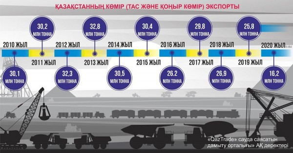 قازاقستان سوڭعى ون جىلدا ورتاشا ەسەپپەن جىل سايىن 25-30 ملن توننا كومىر ەكسپورتتاپ كەلەدى. ماسەلەن, 2010 جىلى تاس جانە قوڭىر كومىردى قوسا ەسەپتەگەندە 30,1 ملن توننا ءونىم شەكارادان اسىرىلعان. 2015 جىلعا دەيىنگى ەكسپورت كولەمى 30 ملن توننادان تومەندەگەن ەمەس. 2016 جىلى شامامەن 4 ملن تونناعا ازايعان. سودان بەرى 30 ملن-دىق مەجە باعىنباي كەلەدى.