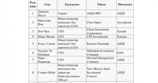 Public Investor-10 – инвестициялық ұйымдардың ең беделді басшыларын қамтитын жаһандық танылған рейтинг. SWFI ұйымы рейтинг жасау кезінде инновацияларды, қорландыруды, экологиялық мәселелерді, кірістілікті, бірегей бағдарламалар және қабылданған бастамаларды қоса алғанда, бірқатар параметрлерді талдайды. Тарихи тұрғыдан алғанда рейтинг TОП-100-ге енген, бірақ биыл SWFI редакциялық алқасы 2020 жылы құбылмалылықты ескере отырып, ең үздік 10 басшыны бөліп көрсету үшін өзгеріс енгізуді ұйғарды.