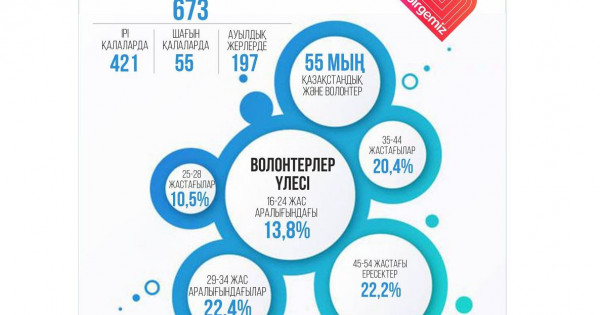 Мемлекет басшысының тапсырмасына сәйкес елдегі волонтерлік қызметті дамыту бағытында көптеген шаруа атқарылды. Биыл еліміздегі волонтер ұйымының саны 673-ке жетті. 421 ұйым ірі қалаларда тіркелсе, ауылдық жерлерде 197 топ жұмыс істейді. Кішігірім қалаларда да волонтерлік топтар бар. Олардың жалпы саны – 55.