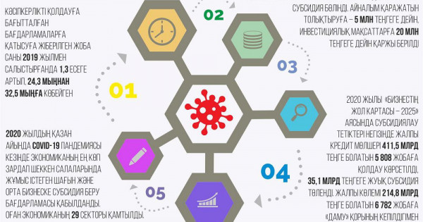 Аяқ астынан болған пандемия жағдайы бизнес саласына ауыр соққы болса да Үкімет тарапынан жасалған батыл қадамдар оларға әжептеуір қолдау болғаны анық. Мысалы, дағдарысқа қарсы шаралардың бірі − «Бизнестің жол картасы – 2025» мемлекеттік бағдарламасына кәсіпкерлікті қолдаудың жаңа бағыттары енгізілді. Соның нәтижесінде бизнес субьектілеріне мөлшерлемесі 6%-дан аспайтын субсидия бөлінді. Айналым қаражатын толықтыруға – 5 млн теңгеге дейін, инвестициялық мақсаттарға 20 млн теңгеге дейін қаржы беріле бастады. Оның кепіл мәселесін «Даму» қоры мойнына алып, жалпы қарыз соманың 85%-на дейінгі мөлшеріне өздері кепілдік берді.