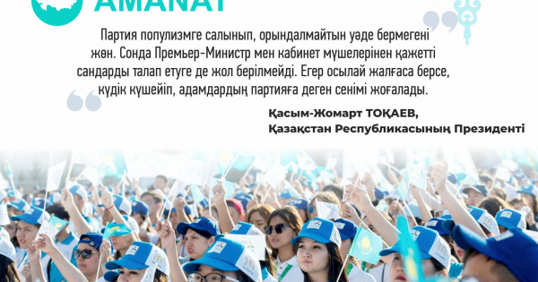 Біріншіден, ата-бабалар аманаты. Тарих туын көтеріп, ұлан-ғайыр атамекенімізді, сұңғыла салт-дәстүрімізді, төгілген тілімізді, таза дінімізді аманат еткен бабалар алдындағы аманат. Екіншіден, үлкен жауапкершілік. Ата-бабалар аманатын осынау ұлан-ғайыр рухани байлықты төкпей-шашпай келер ұрпаққа ұсыну, олардың жадына сіңіру жауапкершілігі. Осы екі үлкен жауапкершілік Amanat партиясының иығына түскен ауыр жүк болмақ. Қазақ деген халықтың өткені мен келешегі үшін бүгін көтерер жүк болмақ. Осындай жүк көтеріпті билік партиясы. Ауыр жүк. Осы жүкті көтере алса, жемқорлық деген дертті жеңе алса, Қазақстан үшін «түнде ұйықтамай, күндіз отырмай» тер төге білсе партия Жаңа Қазақстанды құруға жаңа қадам жасай алады дейміз. Олай болмаса, жағдайы тым қиын болмақ. Осы қиындықтарды жеңіп шыққай, деген тілек білдіреміз. Партияның аты ғана емес, заты жаңарғай деп тілейміз!