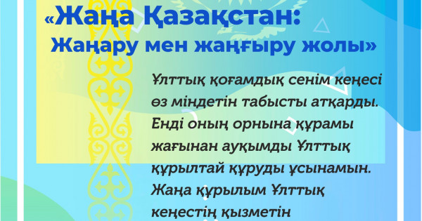 Мемлекет басшысы Жолдау барысында «Ұлттық қоғамдық сенім кеңесі өз міндетін табысты атқарды. Енді оның орнына құрамы жағынан ауқымды Ұлттық құрылтай құруды ұсынамын. Жаңа құрылым Ұлттық кеңестің қызметін жалпыхалықтық деңгейде жалғастырады», деді. Алтайдан Атырауға дейінгі ен далада аттың жалында, түйенің қомында күн кешкен ата-бабамыздың күні кешегі бай, өмірлік тәжірибесін ақыл таразысына салып екшесеңіз, елдік, жалпы жұртқа қатысты келелі шаруасын қабырғасымен кеңесіп шешкен екен. Бірауызды болуы, алты Алаштың ажырамас бірлігі, бақуатты тірлігі әр көкіректегі тілек пен ниеттің бір арнада табысуынан. Бәлкім содан болар, «келісіп пішкен тон келте болмас» деген аталы сөз кейінгі ұрпақтың бойына нәр, санасына сәуле ұялататын ұлағат болып қалған.