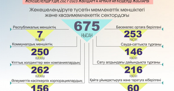 Е.Жамаубаевтың айтуынша, Жекешелендірудің 2021-2025 жылдарға арналған кешенді жоспары мемлекеттік меншіктегі және квазимемлекеттік сектордағы 675 нысанды қамтиды. Оның ішінде республикалық меншіктің 7, коммуналдық меншіктің 250, ұлттық холдингтер мен компаниялардың 262, әлеуметтік-кәсіпкерлік корпорациялардың 156 нысаны бар.