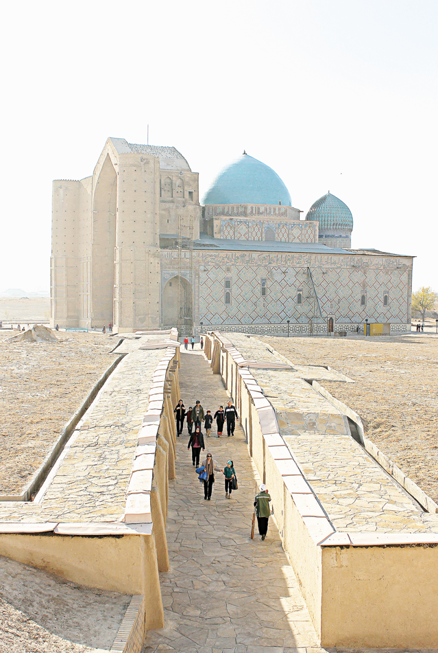 سونىمەن قوجا احمەت ياساۋي كەسەنەسىن سالعان ۇستالار عيماراتتىڭ كوزگە تۇسەتىن ولشەمدەردى قۇران كارىمنىڭ سۇرەلەرى مەن گەومەتريالىق فيگۋرالارعا نەگىزدەلىپ سالعانى انىقتالدى. عيماراتتىڭ حالقىمىزدىڭ كيىز ءۇي سياقتى وڭتۇستىك-شىعىسقا قاراتىپ سالۋ دا كەرەمەت بايلانىس ەكەندىگىن كورسەتەدى. باس قاسبەتتەگى مۇنارالاردىڭ جارتىسى تىك سەگىز جاقتى پريزما بولسا, قالعان ەكىنشى بولىگى تىك دوڭگەلەك تسيليندر. ال ءبۇيىر قابىرعالارىندا سەگىزبۇرىشتار مەن ون ەكى بۇرىشتارى بار. بۇل گەومەتريالىق فيگۋرالاردىڭ ىشىنە قۇران كارىمنەن سۇرەلەر جازىلعان. گەومەتريالىق فيگۋرالدى سالۋدا وتە دالدىكپەن كىرپىشتەردى كولبەۋ جانە تىك ءورۋ ارقاسىندا سالعان.