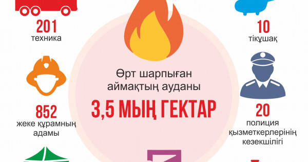 Мәселен, бүгінгі таңда өртті сөндіруге ТЖМ, ІІМ, ЭТРМ, ҚМ, ҚТЖ, жергілікті атқарушы органдары мен облыстық коммуналдық қызметтерінің күштері мен құралдары жұмылдырылған. Тілсіз жауды ауыздықтауға 8 тікұшақ тартылды, оның 3-еуі ТЖМ, 3-еуі ҚМ, 2-уі ЭТРМ-ге тиесілі.