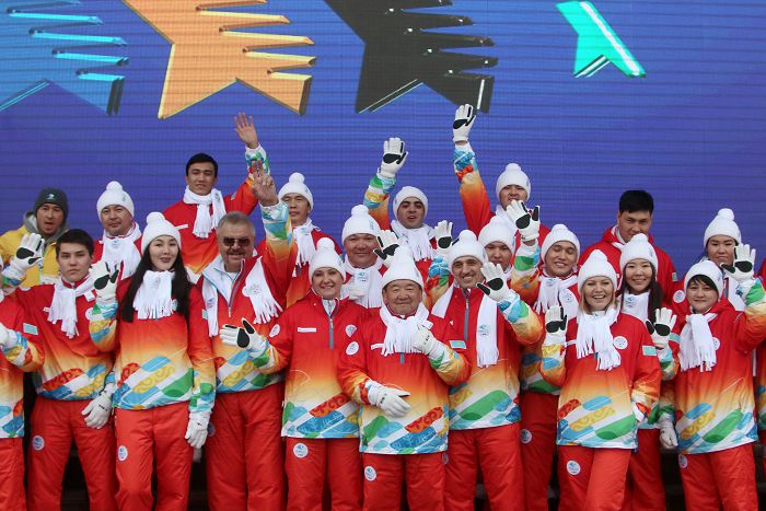 …Алматыда өтетін XXVIII Дүниежүзілік Универсиадаға қатысушы 57 елдің мемлекеттік туларын көтерген жастар қалың топтың арасынан жүріп өтіп, алау тасымалаушыларға жол ашты.