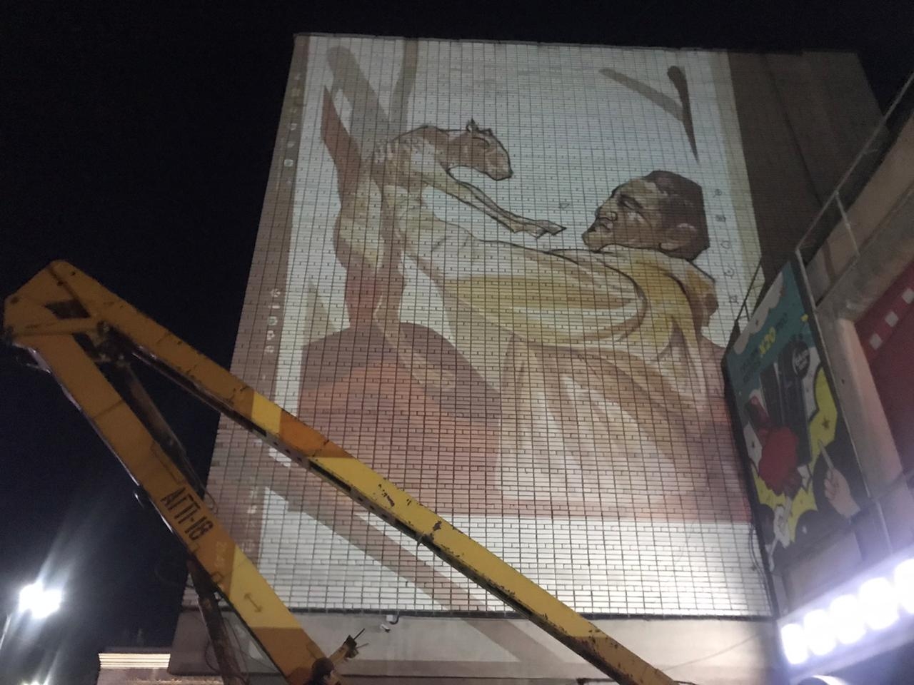Кеншілер астанасындағы көпқабатты үйдің тұтас бір қабырғасына қызмет бабында қаза тапқан қорықшы Ерлан Нұрғалиевтің киіктің лағын көтеріп тұрған әйгілі суреті салынып жатыр.